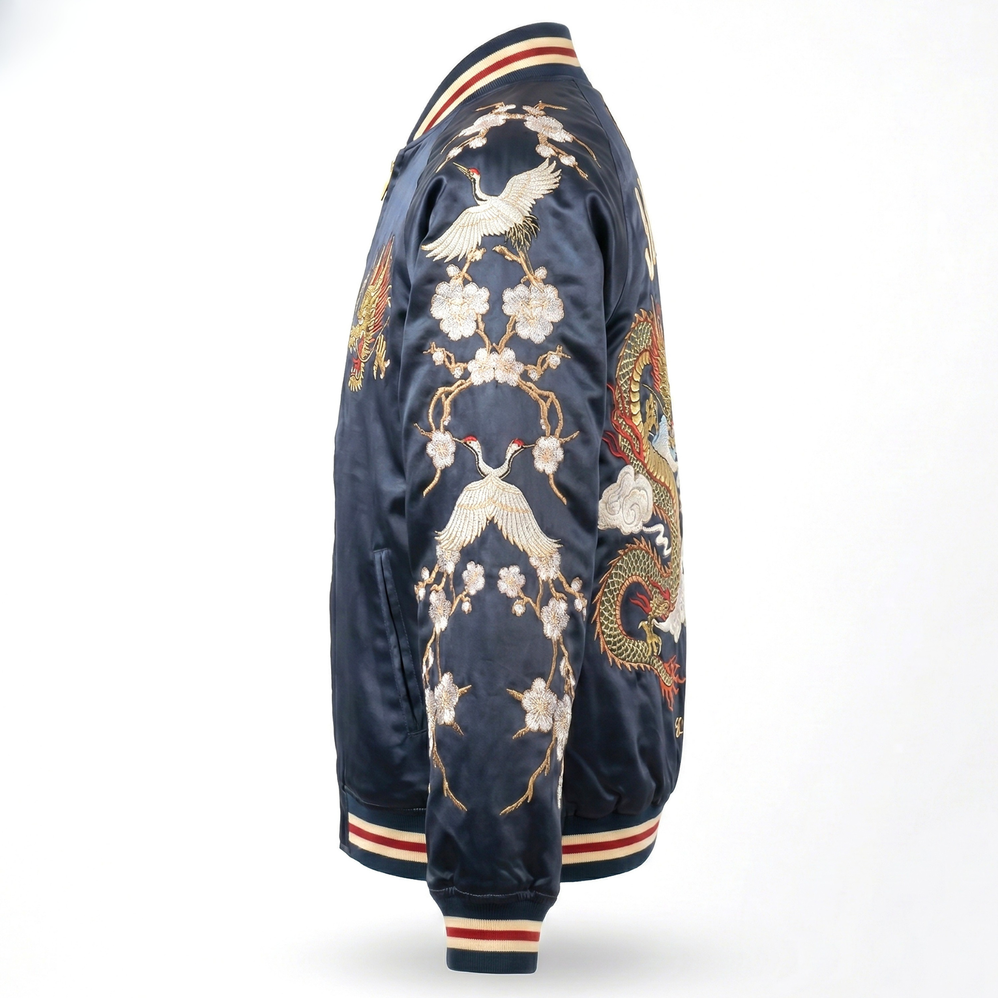 The back of the jacket boasts a massive, vibrant scene: a fierce golden dragon and a roaring tiger facing off beneath the snowy peak of Mount Fuji, crowned with classic arched “JAPAN” lettering. The artistry continues onto the front with a striking tiger and dragon motif flanked by traditional Kanji characters. Finally, the sleeves are heavily detailed with elegant white cranes in flight among delicate cherry blossom (sakura) branches.